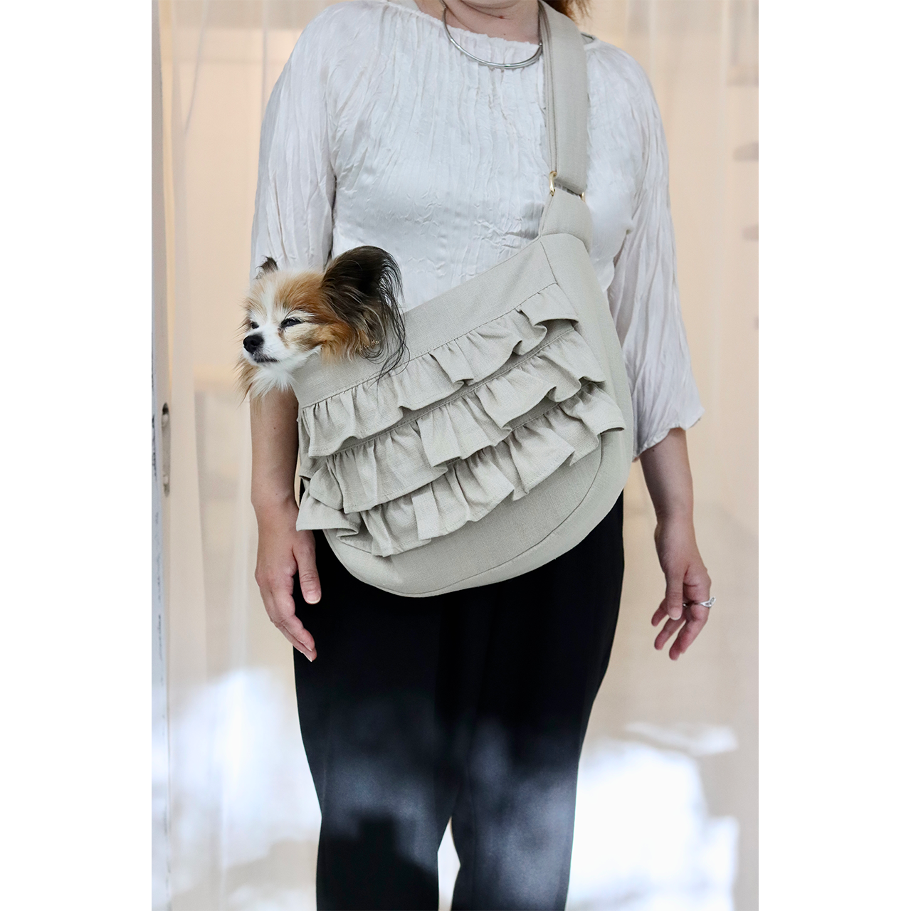フリルがたっぷりあしらわれた可愛いスリングバッグが登場!使いやすいベージュとブラックの2色展開。コットン、リネン混でオールシーズン快適に使えます。ボディの片面はゴム入りの大容量ポケット、内側にはスリットタイプの大きなツーポケットあり。たっぷり収納出来るのでこれ一つでお出かけも可能です♪