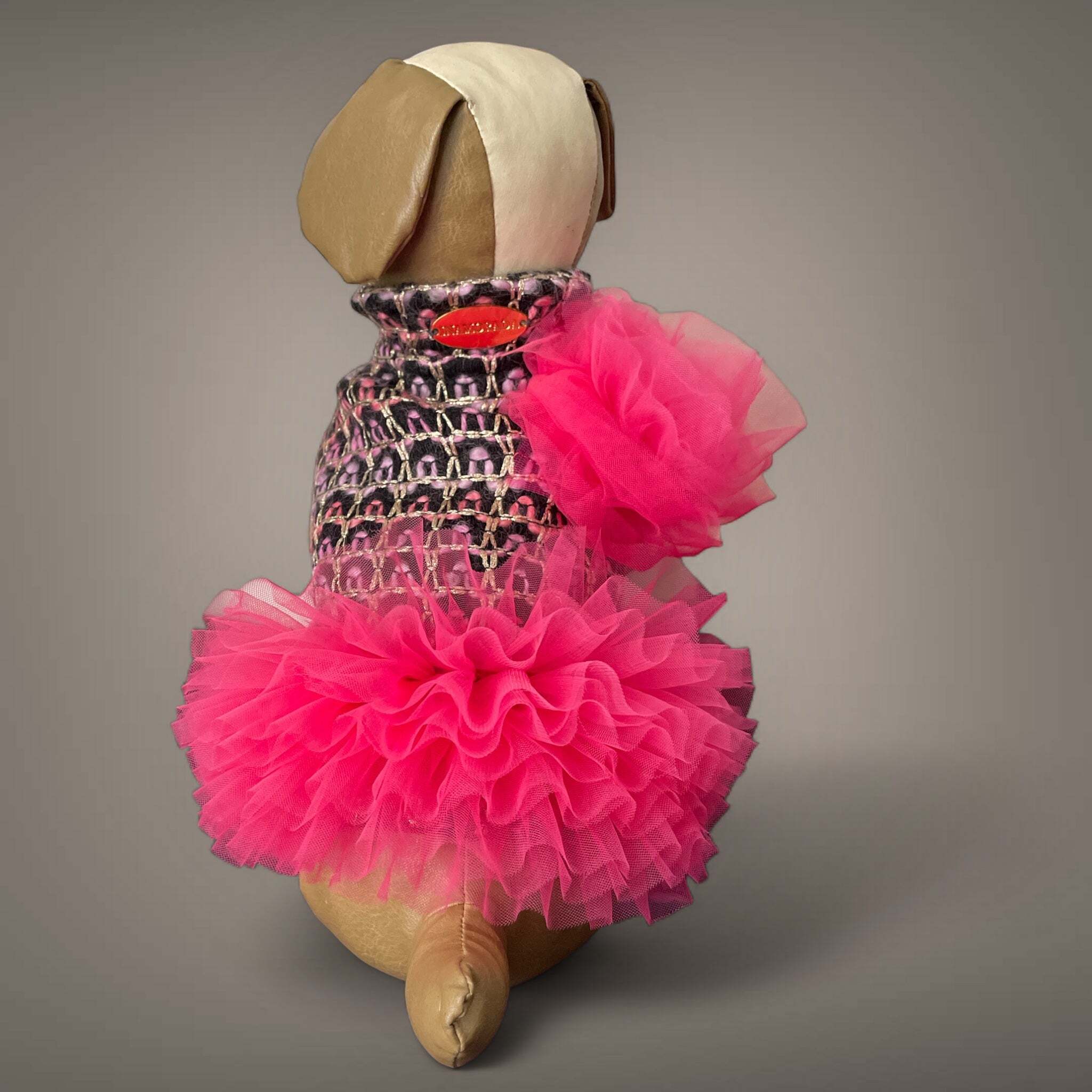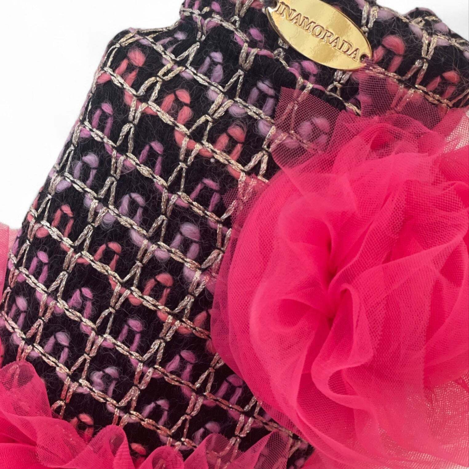 多色・多糸のウールで丁寧に編み上げられ、洗練された目を引く幾何学模様が特徴です。繊細な多層チュールで装飾されたスカートは、軽やかさと動きを加えています。