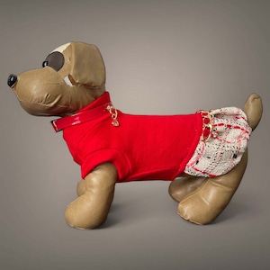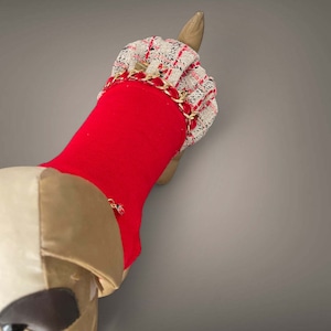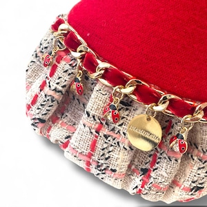 完璧なシャネルスタイルと生地で仕立てられ、カシミアのようなストレッチウールのトップと、ビスコース裏地のギャザードシャネルスカートが特徴です。